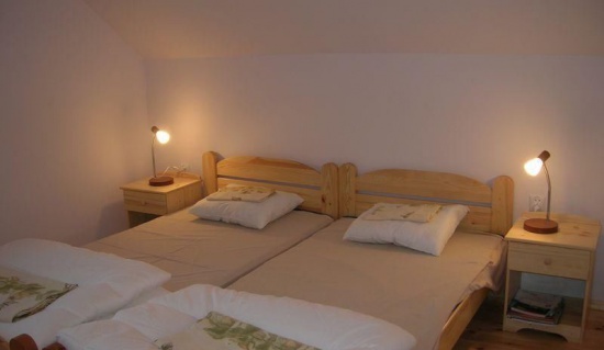 Domek dla 6-9 osób (jedna sypialnia z łazienką, dwie sypialnie z łazienką wspólną, pokój kominkowy z aneksem kuchennym). Domek wynajmujemy w całości na wyłączność. W wolnych terminach dostępne są także poszczególne pokoje w domku.